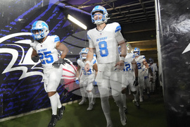 Detroit Lions running back Kye Robichaux (25) and quarterback Kyle Allen (8) lead teammates onto the field prior to an NFL football game against the Baltimore Ravens Monday, Sept. 22, 2025, in Baltimore. (AP Photo/Stephanie Scarbrough)