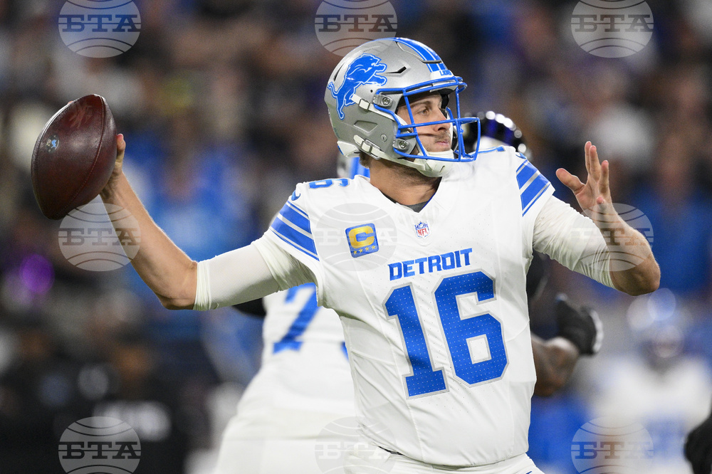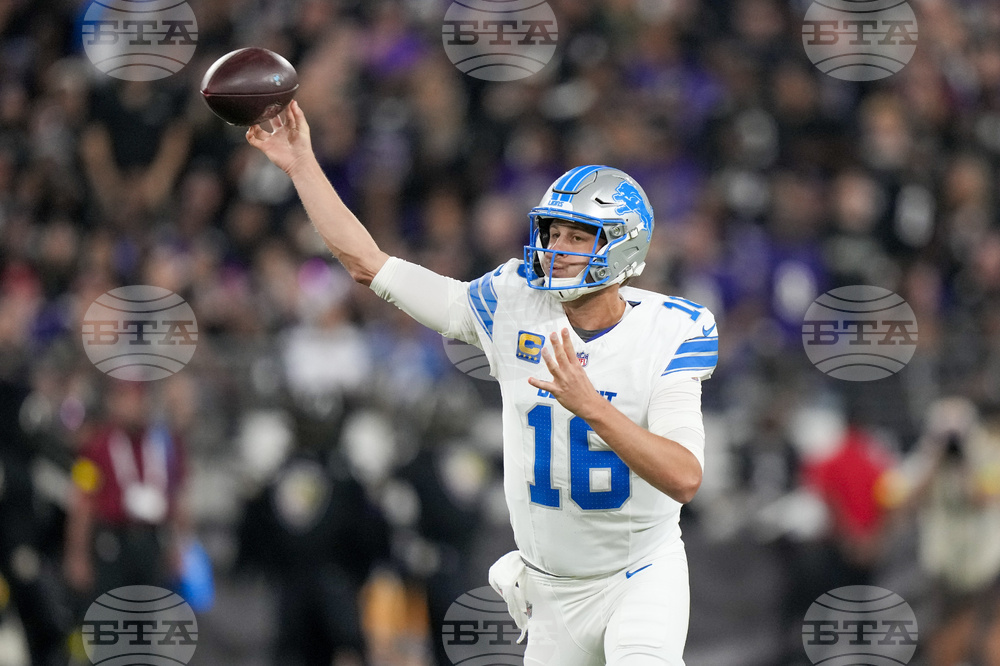 Detroit Lions quarterback Jared Goff throws a pass against the Baltimore Ravens during the first half of an NFL football game Monday, Sept. 22, 2025, in Baltimore. (AP Photo/Stephanie Scarbrough)