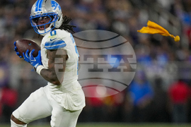 Detroit Lions running back Jahmyr Gibbs runs the ball against the Baltimore Ravens during the first half of an NFL football game Monday, Sept. 22, 2025, in Baltimore. (AP Photo/Stephanie Scarbrough)