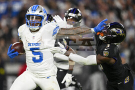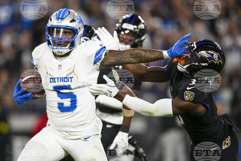 Detroit Lions running back David Montgomery (5) applies a stiff arm on Baltimore Ravens cornerback Chidobe Awuzie (3) while rushing for yardage during the second half of an NFL football game Monday, Sept. 22, 2025, in Baltimore. (AP Photo/Nick Wass)