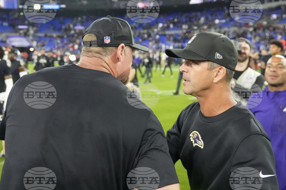 Baltimore Ravens head coach John Harbaugh talks to reporters following an NFL football game against the Detroit Lions Monday, Sept. 22, 2025, in Baltimore. (AP Photo/Nick Wass)