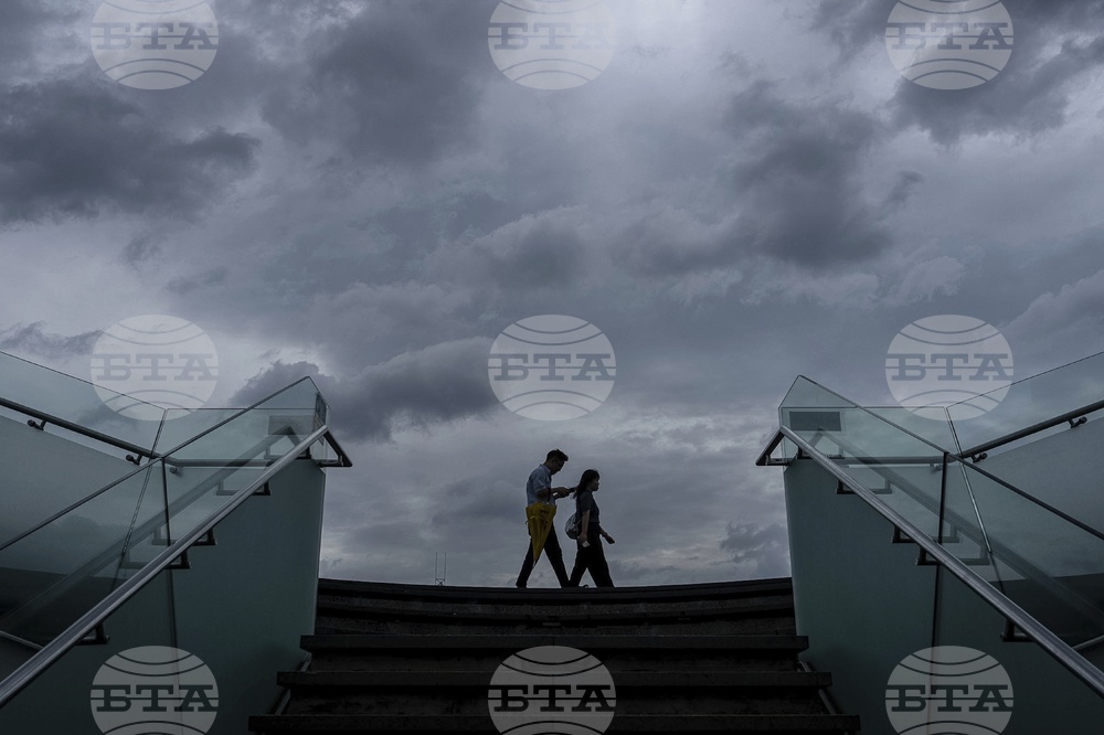 Pedestrians walk along the waterfront of Victoria Harbor ahead of Super Typhoon Ragasa approaches Hong Kong, Tuesday, Sept. 23, 2025. (AP Photo/Chan Long Hei)