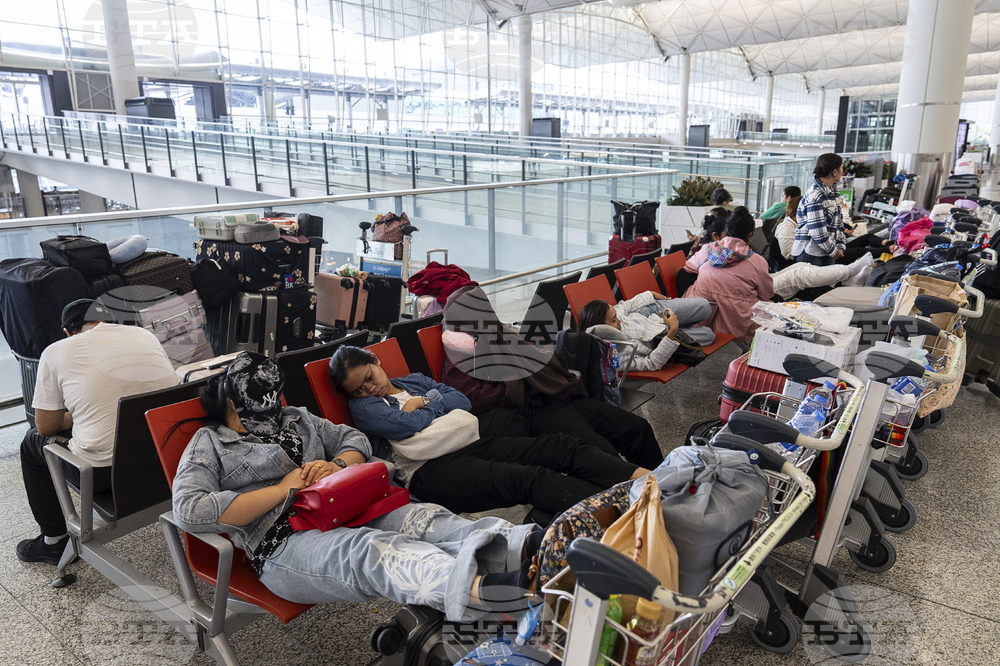 Passengers rest at the Hong Kong International Airport ahead of the super typhoon Ragasa approaching Hong Kong, Tuesday, Sept. 23, 2025. (AP Photo/Chan Long Hei)