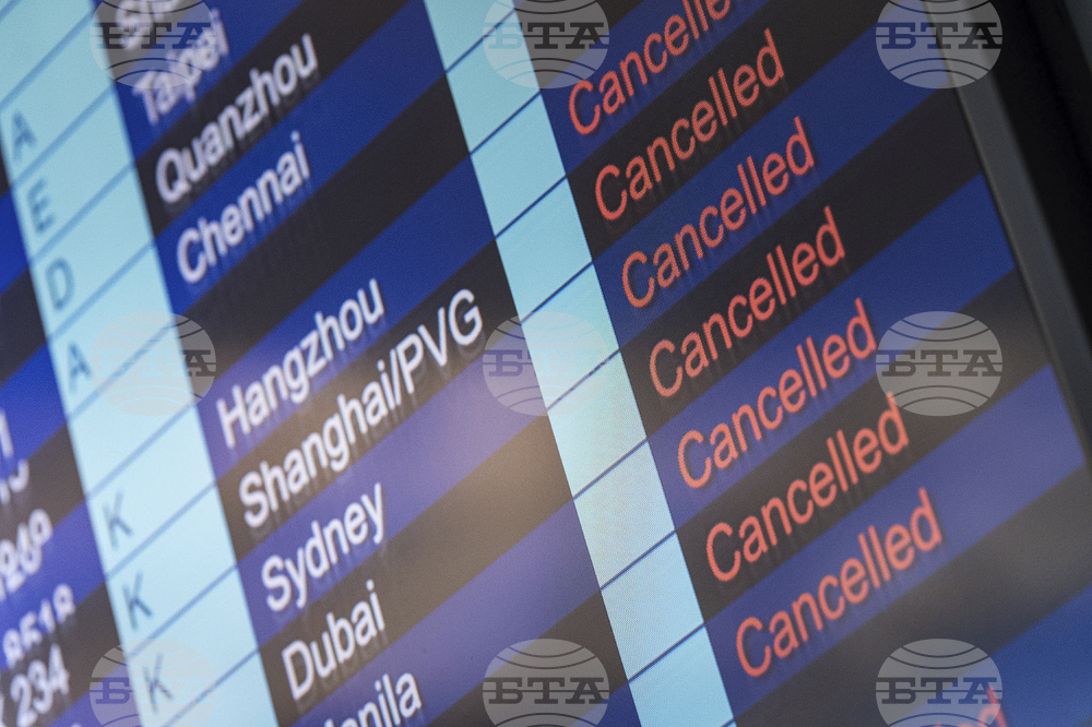 An information display board showing canceled flights due to the super typhoon Ragasa, at the Hong Kong International Airport in Hong Kong, Tuesday, Sept. 23, 2025. (AP Photo/Chan Long Hei)