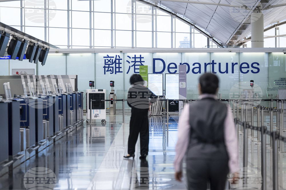 Staff members in an empty check-in counter at the Hong Kong International Airport ahead of the super typhoon Ragasa approaching Hong Kong, Tuesday, Sept. 23, 2025. (AP Photo/Chan Long Hei)