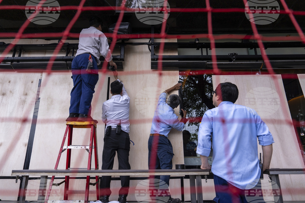 Workers install protective barriers at a restaurant ahead of the super typhoon Ragasa approaching Hong Kong, Tuesday, Sept. 23, 2025. (AP Photo/Chan Long Hei)