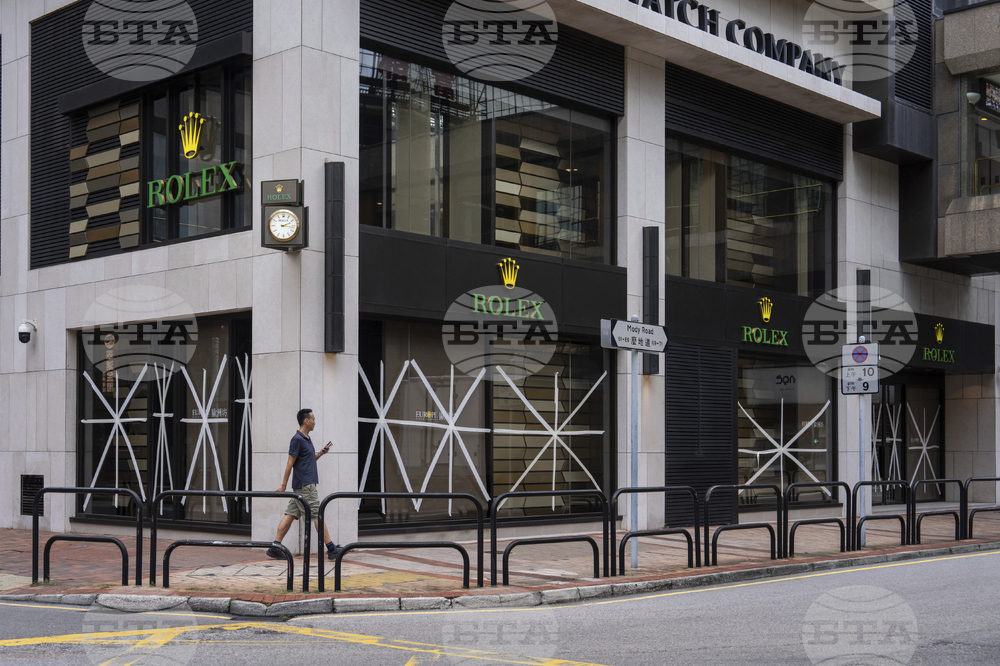 Taped-up windows at a luxury store ahead of the super typhoon Ragasa approaching Hong Kong, Tuesday, Sept. 23, 2025. (AP Photo/Chan Long Hei)