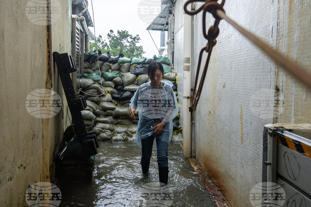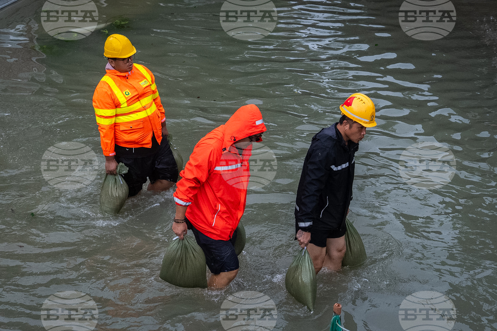 Workers carry sandbags as they walk through the floodwaters in Lei Yue Mun area as super typhoon Ragasa approaches in Hong Kong, Wednesday, Sept. 24, 2025. (AP Photo/Chan Long Hei)