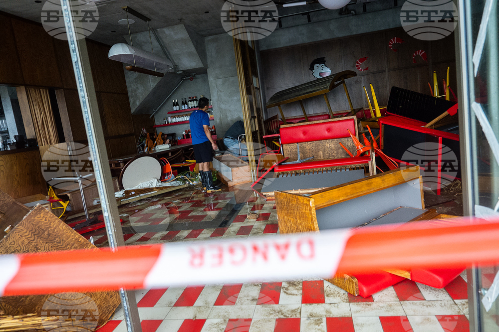 Furniture damaged by floodwater at a restaurant in Tseung Kwan O area, as super typhoon Ragasa approaches in Hong Kong, Wednesday, Sept. 24, 2025. (AP Photo/Chan Long Hei)