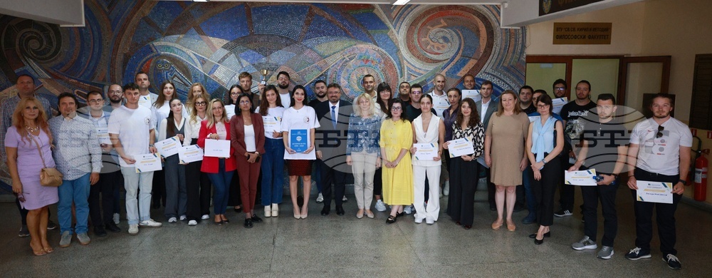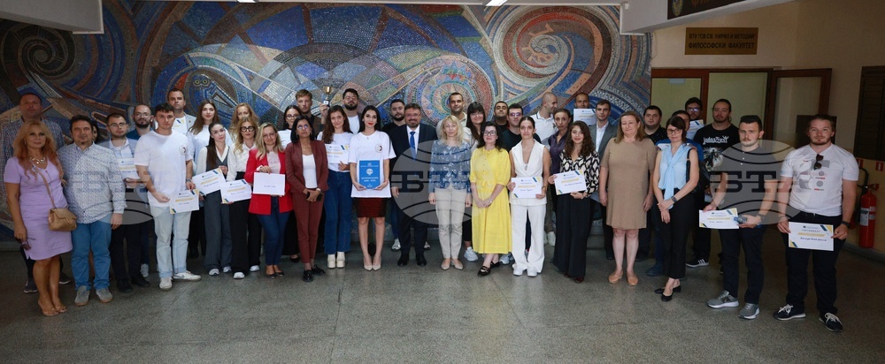 Велико Търново (23 Септември 2025) Националният хакатон „Популяризиране на политиката на сближаване на ЕС“ се провежда във Великотърновския университет. Организатор на събитието е Българската телеграфна агенция. В състезанието участват седем отбора от цялата страна. Това са отборите на Бургаския свободен университет, на Русенския университет, на Техническия университет в Габрово, Икономическия университет във Варна, Университета по хранителни технологии в Пловдив, Югозападния университет от Благоевград и Великотърновския университет "Св.св. Кирил и Методий". На снимката: генералният директор на БТА Кирил Вълчев (вляво) зедно с отбор Пловдив.