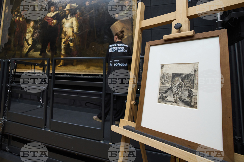 Rijksmuseum director Taco Dibbits, right, and curator Anne Lenders, left, talk about the 17th century drawing by Dutch artist Adriaen van de Venne, on the easel, which inspired Rembrandt when painting a dog in the Night Watch, in Amsterdam, Netherlands, Tuesday, Sept. 23, 2025. (AP Photo/Peter Dejong)