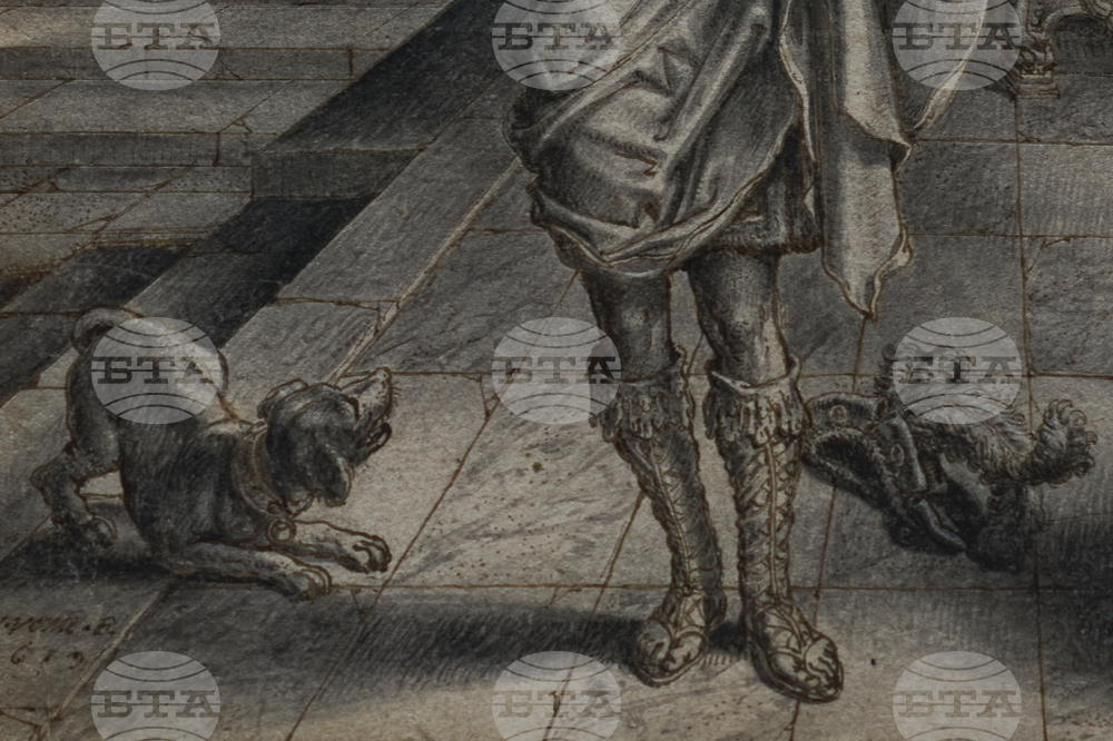 The 17th century drawing by Dutch artist Adriaen van de Venne which inspired Rembrandt when painting a dog in the Night Watch, is shown on an easel at the Rijksmuseum in Amsterdam, Netherlands, Tuesday, Sept. 23, 2025. (AP Photo/Peter Dejong)