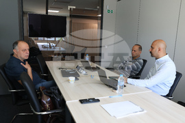 София (16 септември 2025) Управляващите собственици на GPS България и управителят на Mobiliz (турска фирма, собственост на GPS България) дискутират в заседателната зала на GPS България. На снимката: управляващите съсобственици на „GPS България“ АД Христо Даскалов (вляво) и Николай Кичев (вдясно), и управителят на Mobiliz Йеткин Аксой (в средата).
