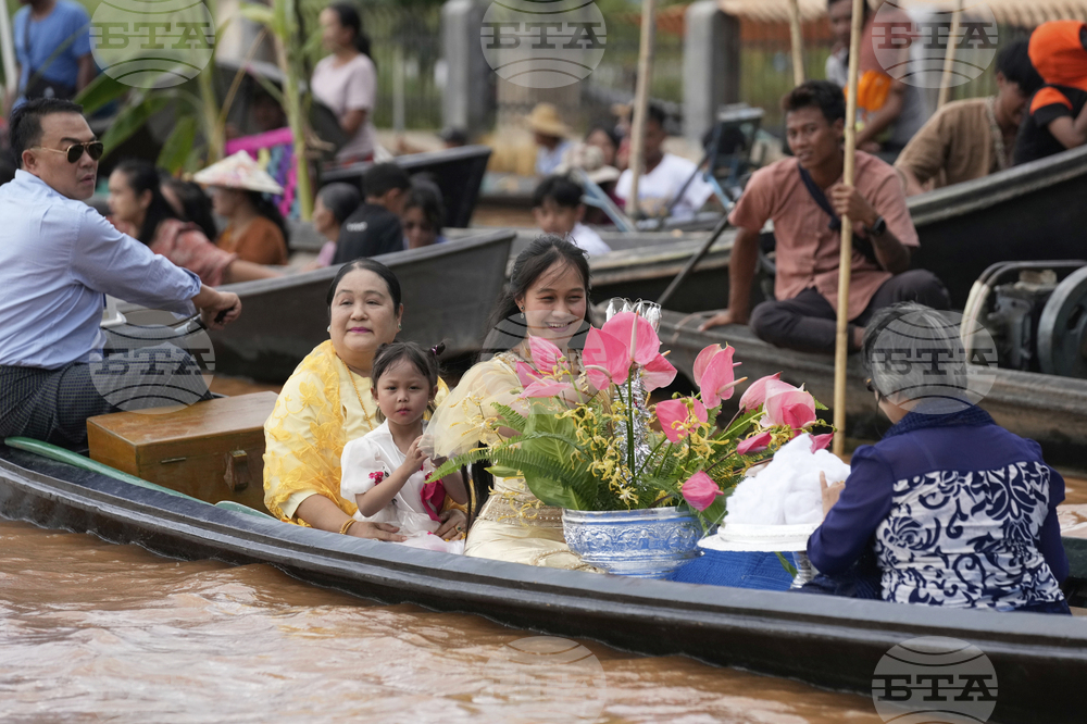Ethnic Intha people carry offerings in a boat during the Phaung Daw Oo pagoda festival in Inle Lake, southern Shan State, Myanmar, Tuesday, Sept. 23, 2025. (AP Photo/Thein Zaw)
