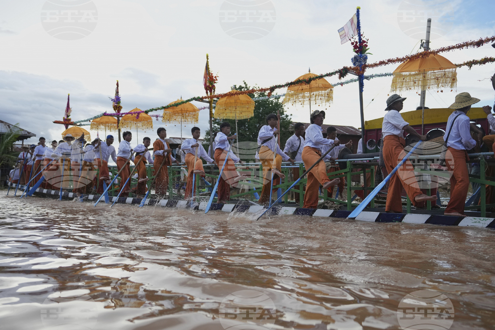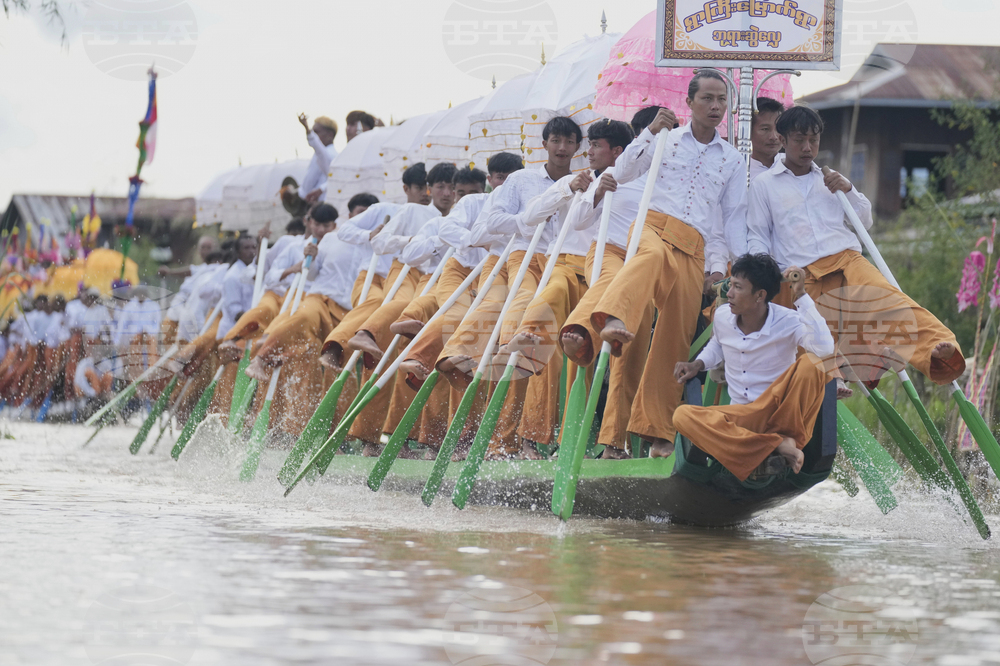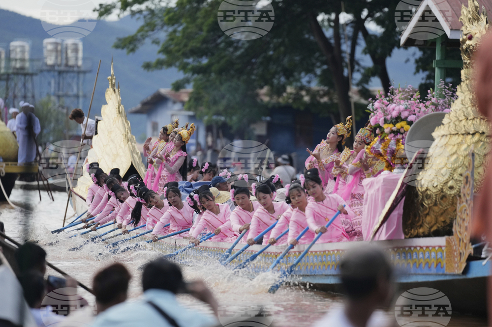 Ethnic Inntha people carry offerings in a boat during the Paung-Daw-Oo pagoda festival in Inle Lake, southern Shan State, Myanmar, Tuesday, Sept. 23, 2025. (AP Photo/Thein Zaw)