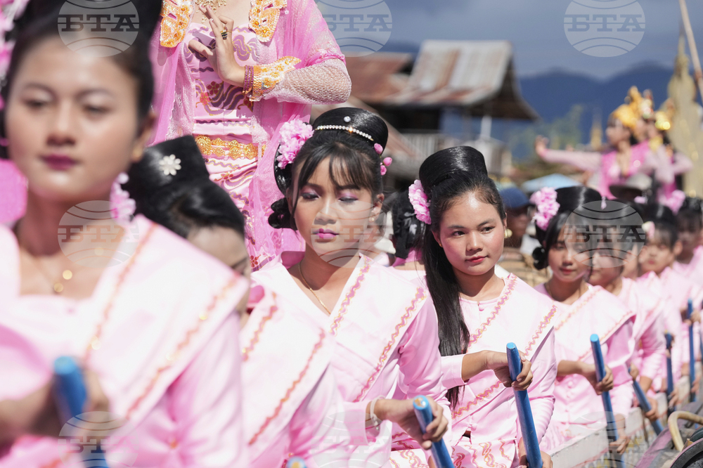 Ethnic Intha people perform during the Phaung Daw Oo pagoda festival in Inle Lake, southern Shan State, Myanmar, Tuesday, Sept. 23, 2025. (AP Photo/Thein Zaw)