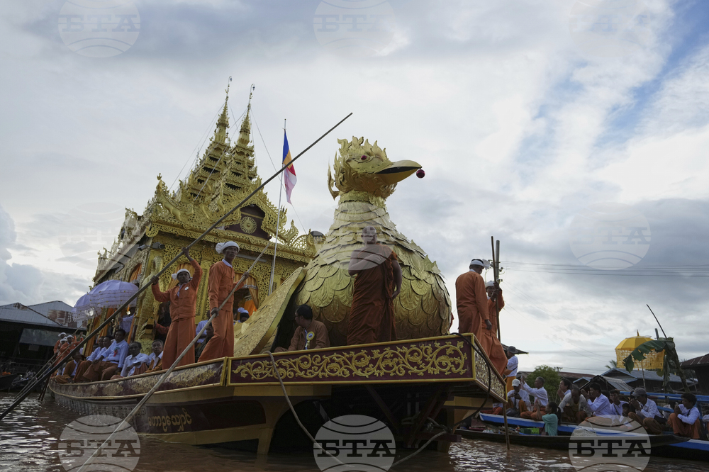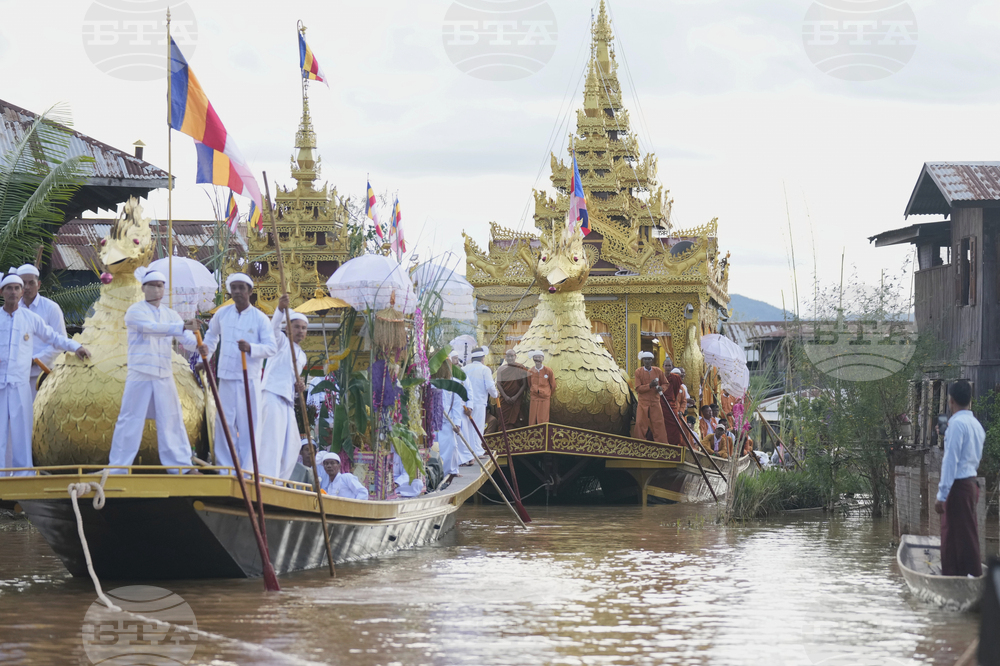Barges carrying Buddha statues float during the Paung-Daw-Oo pagoda festival in Inle Lake, southern Shan State, Myanmar, Tuesday, Sept. 23, 2025. (AP Photo/Thein Zaw)