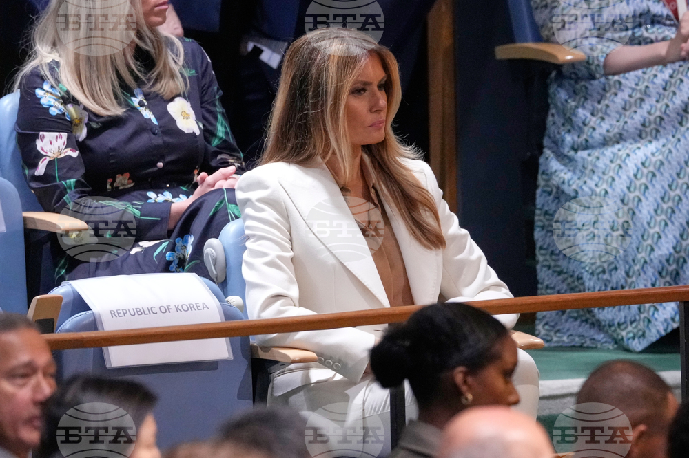 First Lady Melania Trump watches as U.S. President Donald Trump addresses the 80th session of the United Nations General Assembly, Tuesday, Sept. 23, 2025. (AP Photo/Richard Drew)