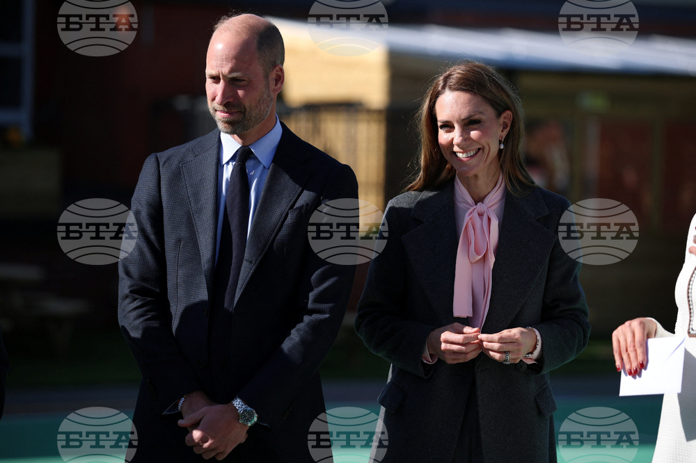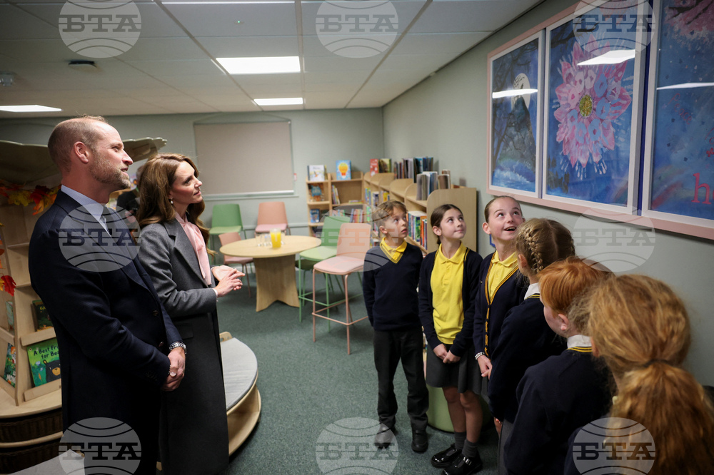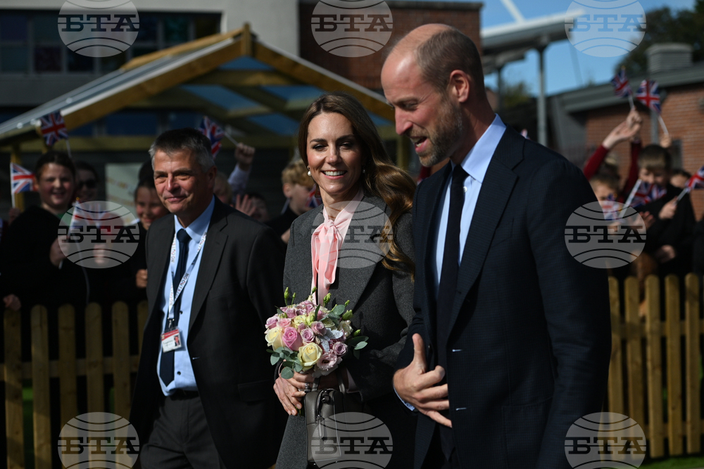 Britain's Prince William, left, and Kate, Princess of Wales visit Churchtown Primary School, Southport, England, Tuesday Sept. 23, 2025. (Phil Noble/Pool Photo via AP)