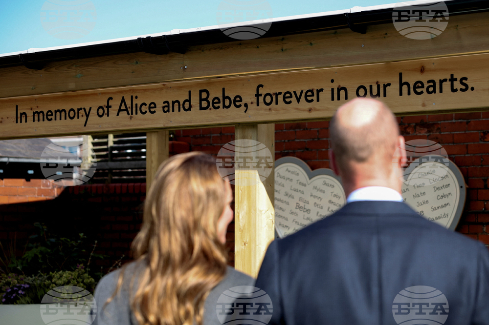 Britain's Prince William, left, and Kate, Princess of Wales, second left, look at the new commemorative playground at Churchtown Primary School, created in memory of former pupils Bebe King and Alice da Silva Aguiar, during their visit to Southport, England, Tuesday Sept. 23, 2025. (Phil Noble/Pool Photo via AP)