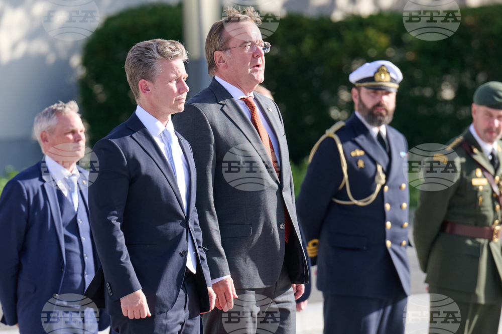 German Defense Minister Boris Pistorius, center, receives his Swedish counterpart Pal Jonson, 2nd left, with military honors in Berlin, Tuesday, Sept. 23, 2025. (Annette Riedl/dpa via AP)