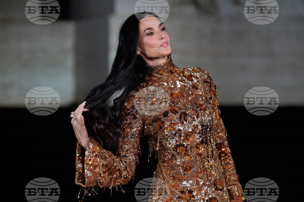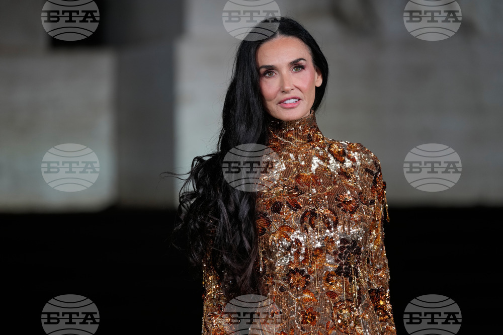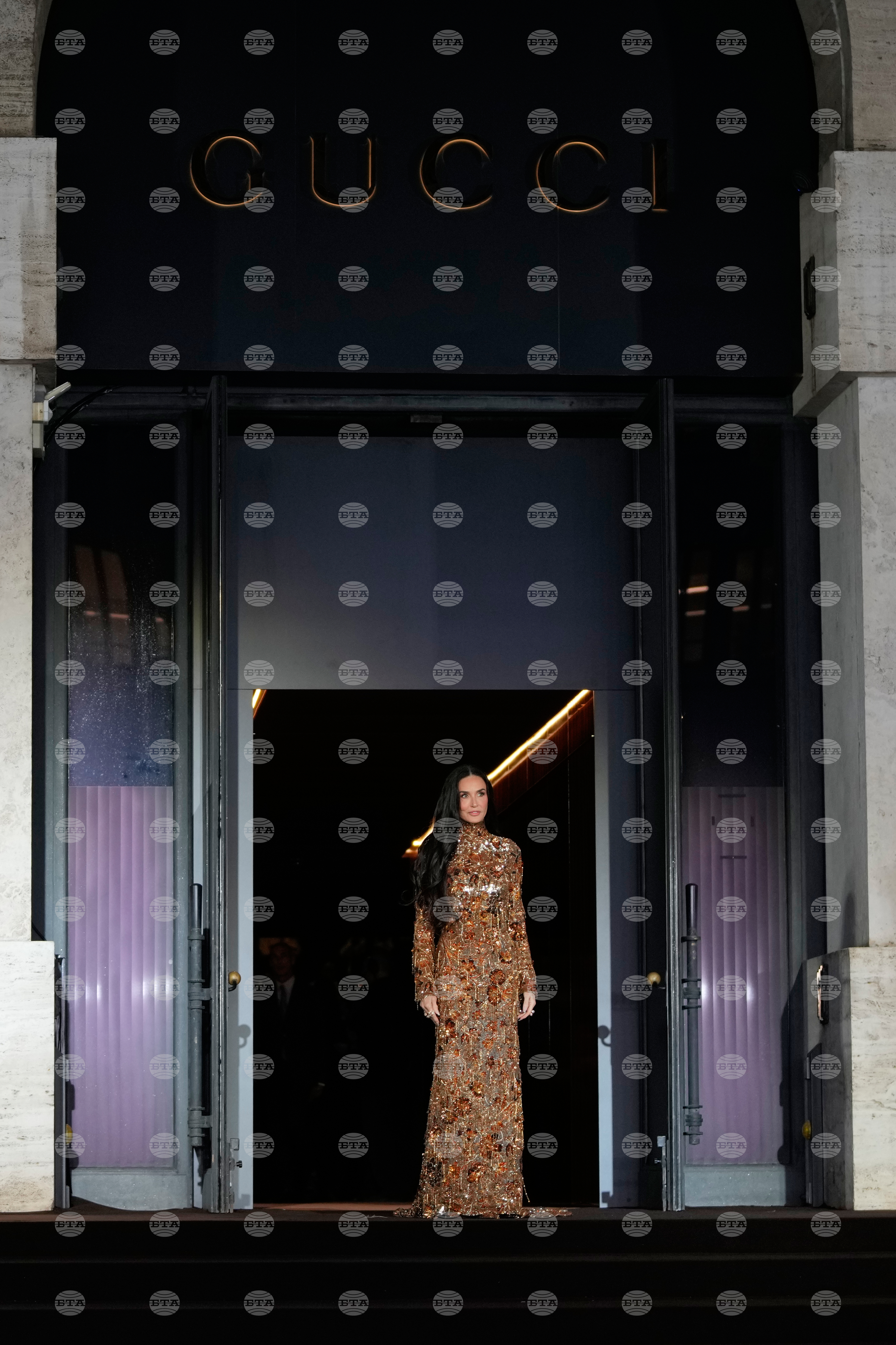 Demi Moore arrives for the premiere of the short film "The Tiger," directed by Spike Jonze and Halina Reijn, featuring the first looks by Gucci's new creative director, Demna, in Milan, northern Italy, Tuesday, Sept. 23, 2025. (AP Photo/Luca Bruno)