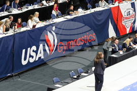FILE - Signage showing the new USA Gymnastics logo is displayed during the 2022 U.S. Gymnastics Championships, Friday, Aug. 19, 2022, in Tampa, Fla.(AP Photo/Mike Carlson, file)