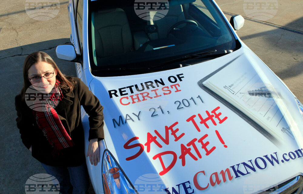 FILE - Allison Warden poses with her car in Raleigh, N.C., Dec. 17, 2010, showing a message about the rapture. (AP Photo/Gerry Broome, File)