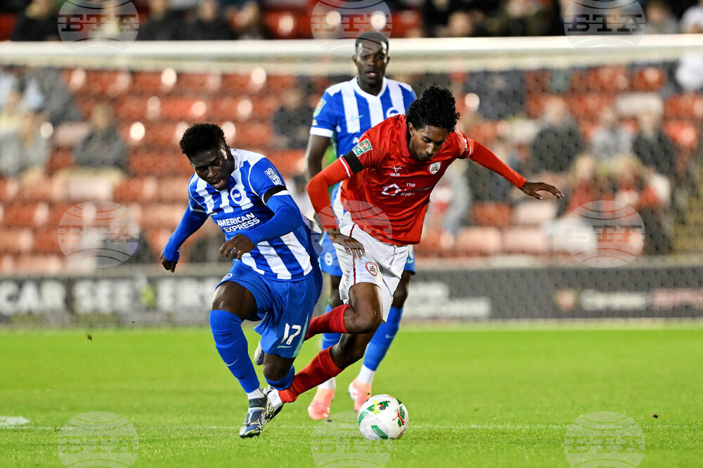 Brighton and Hove Albion's Carlos Baleba, left, and Barnsley's Vimal Yoganathan in action during the English League Cup third round soccer match between Barnsley and Brighton & Hove Albion at Oakwell Stadium, Barnsley, England, Tuesday Sept. 23, 2025. (Cody Froggatt/PA via AP)