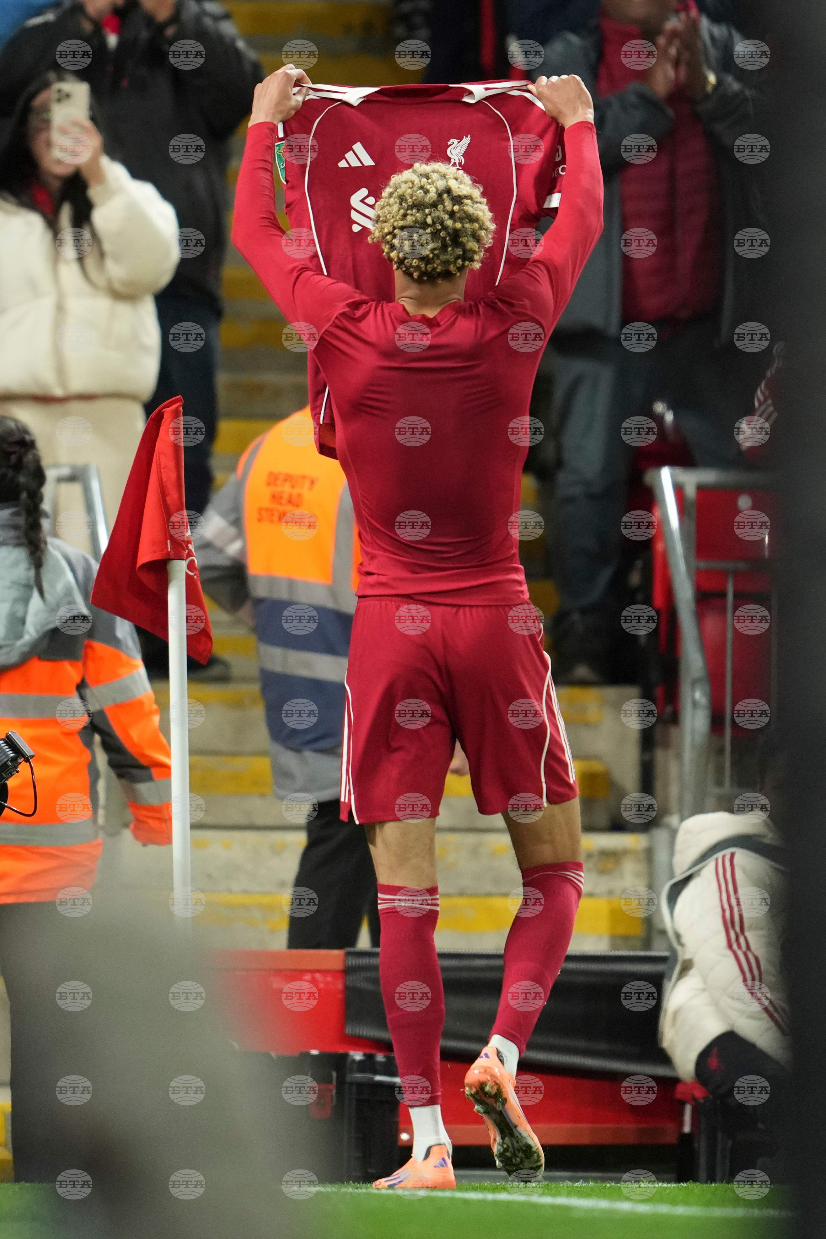 Liverpool's Hugo Ekitike celebrates after scoring his side's second goal during the English League Cup third round soccer match between Liverpool and Southampton at the Anfield stadium in Liverpool, England, Tuesday, Sept. 23, 2025. (Peter Byrne/PA via AP)