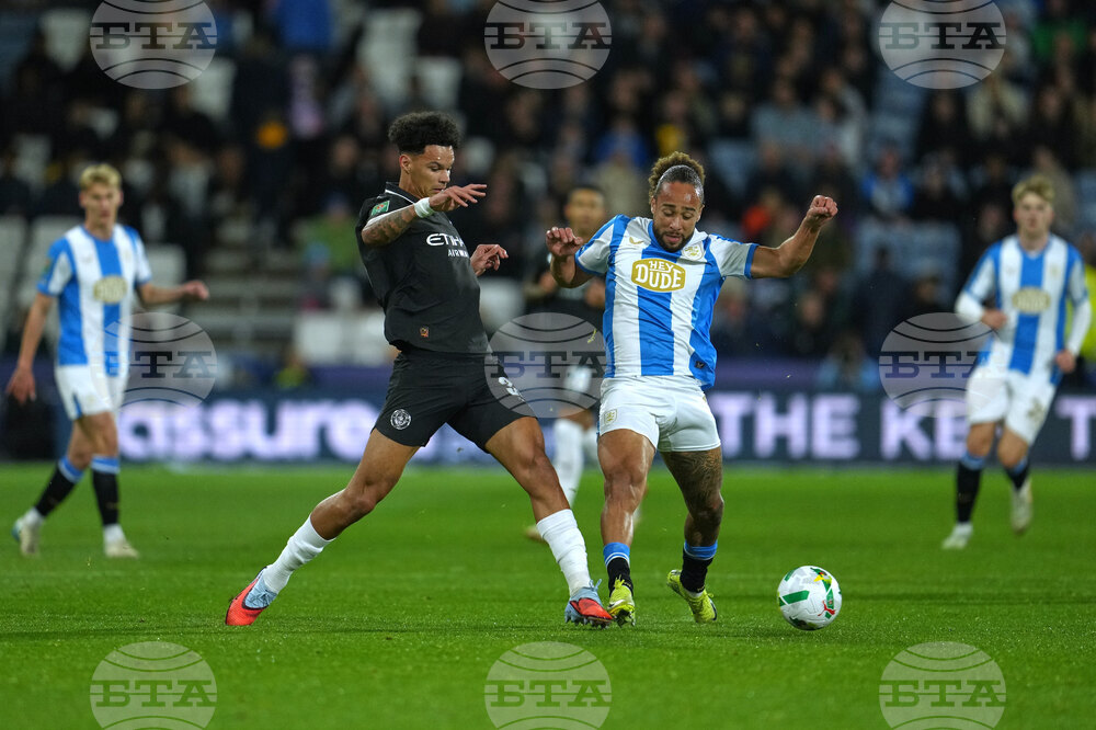 Manchester City's Nico O'Reilly, left, fights for the ball with Huddersfield's Marcus Harness during the English League Cup third round soccer match between Huddersfield and Manchester City at the John Smith's stadium, in Huddersfield, England, Wednesday, Sept. 24, 2025. (AP Photo/Jon Super),