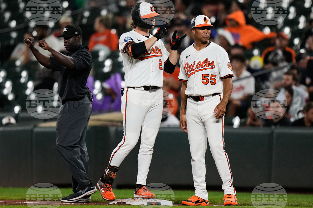 Baltimore Orioles relief pitcher Yaramil Hiraldo (76) celebrates his team's victory over the Tampa Bay Rays after a baseball game, Tuesday, Sept. 23, 2025, in Baltimore. (AP Photo/Stephanie Scarbrough)