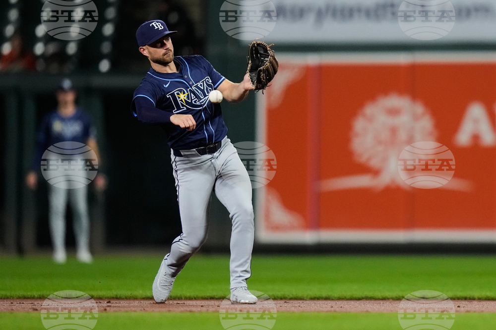 Tampa Bay Rays second baseman Brandon Lowe throws to first base to make the out against Baltimore Orioles' Adley Rutschman during the second inning of a baseball game, Tuesday, Sept. 23, 2025, in Baltimore. (AP Photo/Stephanie Scarbrough)