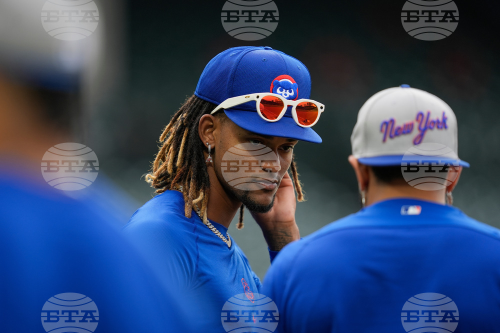 Green Day drummer Tre Cool throws out a ceremonial first pitch before a baseball game between the Chicago Cubs and New York Mets, Tuesday, Sept. 23, 2025, in Chicago. (AP Photo/Erin Hooley)