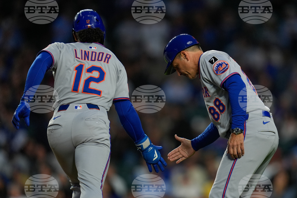New York Mets' Francisco Lindor (12) slaps hands with third base coach Mike Sarbaugh (88) as he runs the bases after hitting a home run during the first inning of a baseball game against the Chicago Cubs, Tuesday, Sept. 23, 2025, in Chicago. (AP Photo/Erin Hooley)