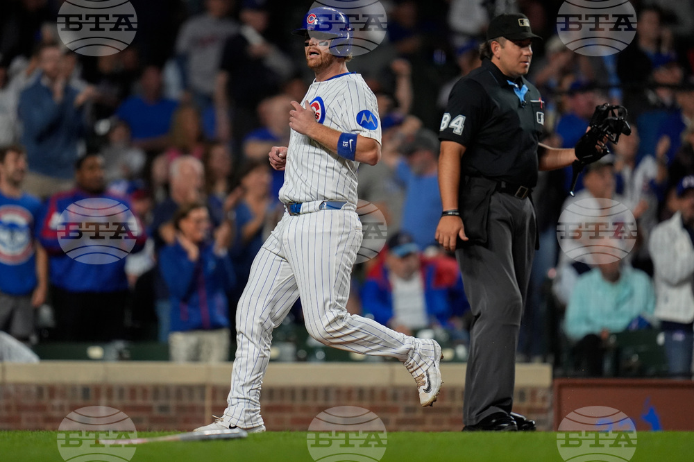 Umpire John Libka (84) signals during the first inning of a baseball game between the New York Mets and Chicago Cubs. Tuesday, Sept. 23, 2025, in Chicago. (AP Photo/Erin Hooley)
