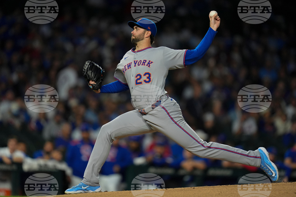 New York Mets starting pitcher David Peterson (23) throws against the Chicago Cubs during the first inning of a baseball game Tuesday, Sept. 23, 2025, in Chicago. (AP Photo/Erin Hooley)
