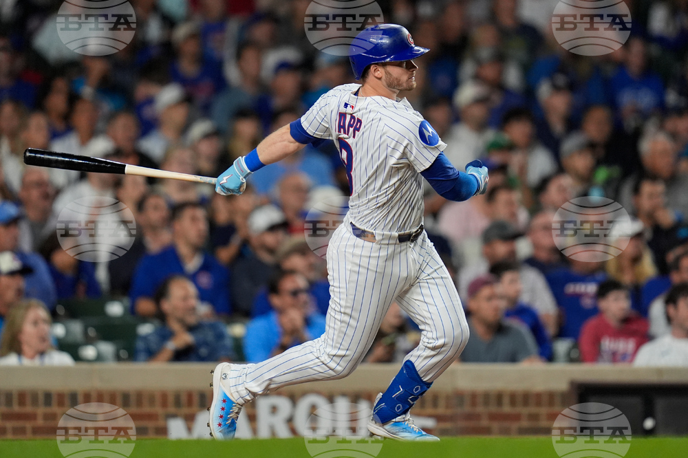 Chicago Cubs' Seiya Suzuki (27) runs to first on a one-run single during the sixth inning of a baseball game against the New York Mets, Tuesday, Sept. 23, 2025, in Chicago. (AP Photo/Erin Hooley)