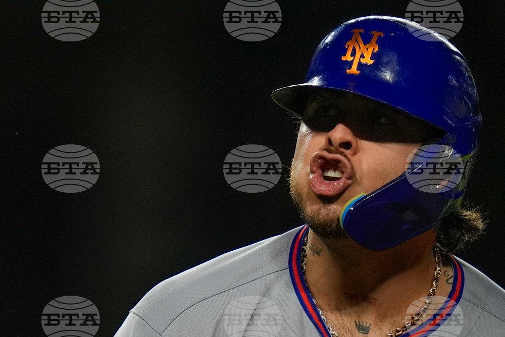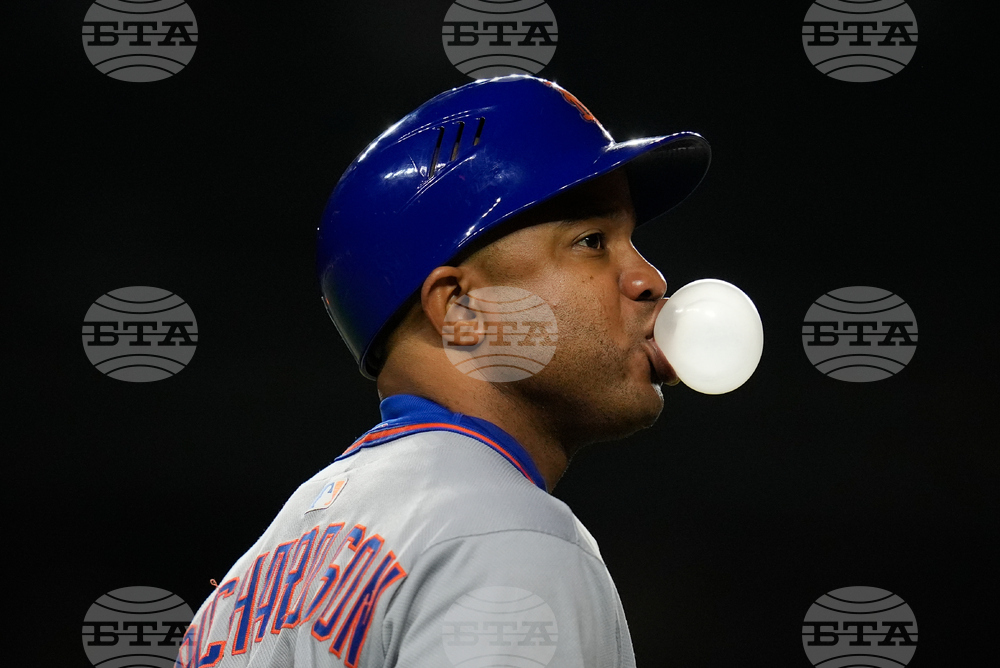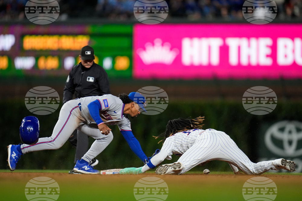 New York Mets first base coach Antoan Richardson (66) blows a bubble during the fourth inning of a baseball game against the Chicago Cubs, Tuesday, Sept. 23, 2025, in Chicago. (AP Photo/Erin Hooley)