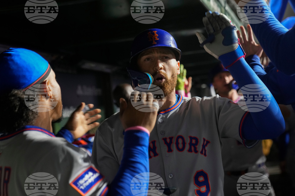 New York Mets' Brandon Nimmo (9) celebrates his three-run home run during the fifth inning of a baseball game against the Chicago Cubs, Tuesday, Sept. 23, 2025, in Chicago. (AP Photo/Erin Hooley)