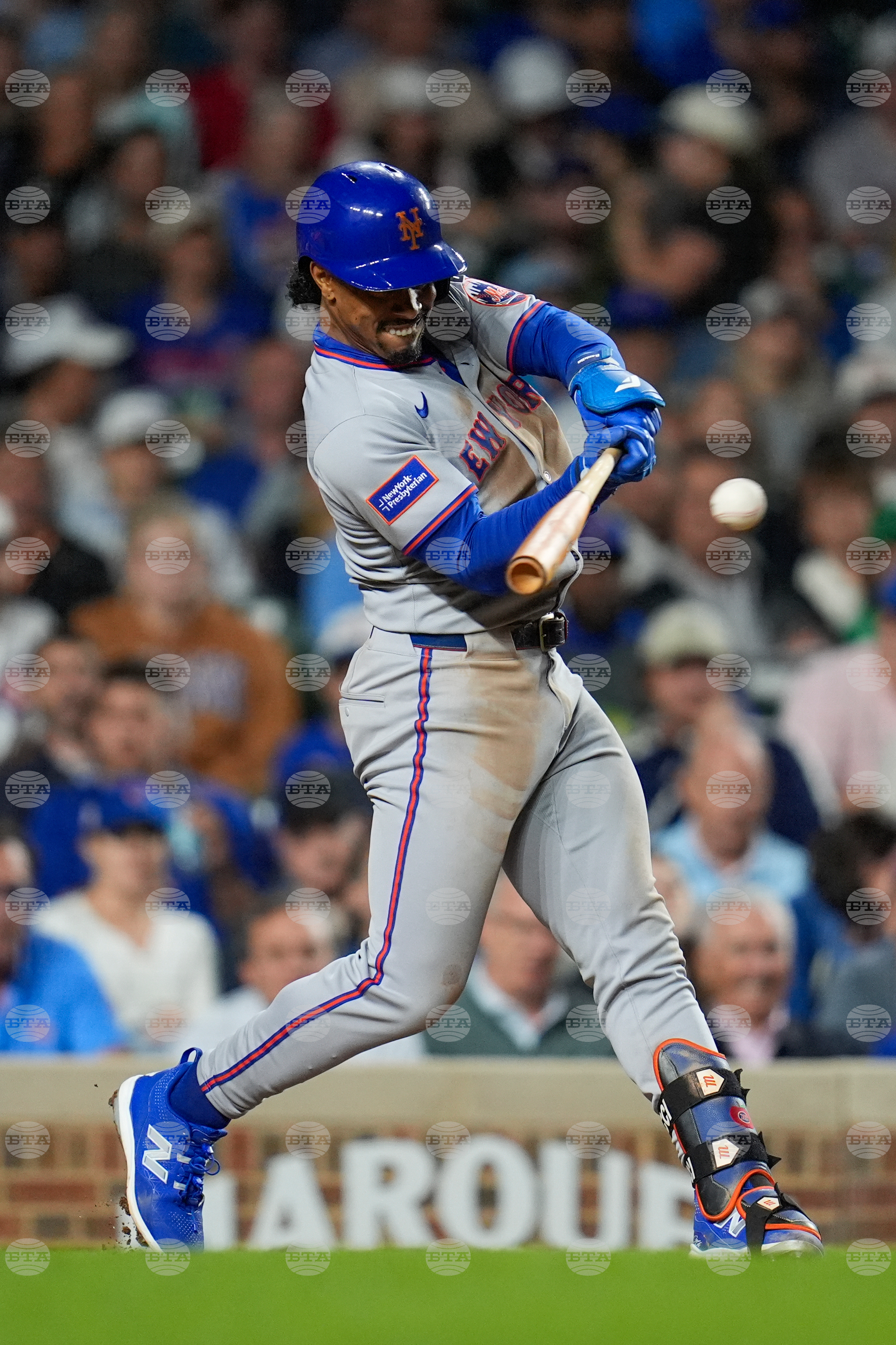 New York Mets' Francisco Lindor (12) hits a one-run single during the sixth inning of a baseball game against the Chicago Cubs, Tuesday, Sept. 23, 2025, in Chicago. (AP Photo/Erin Hooley)