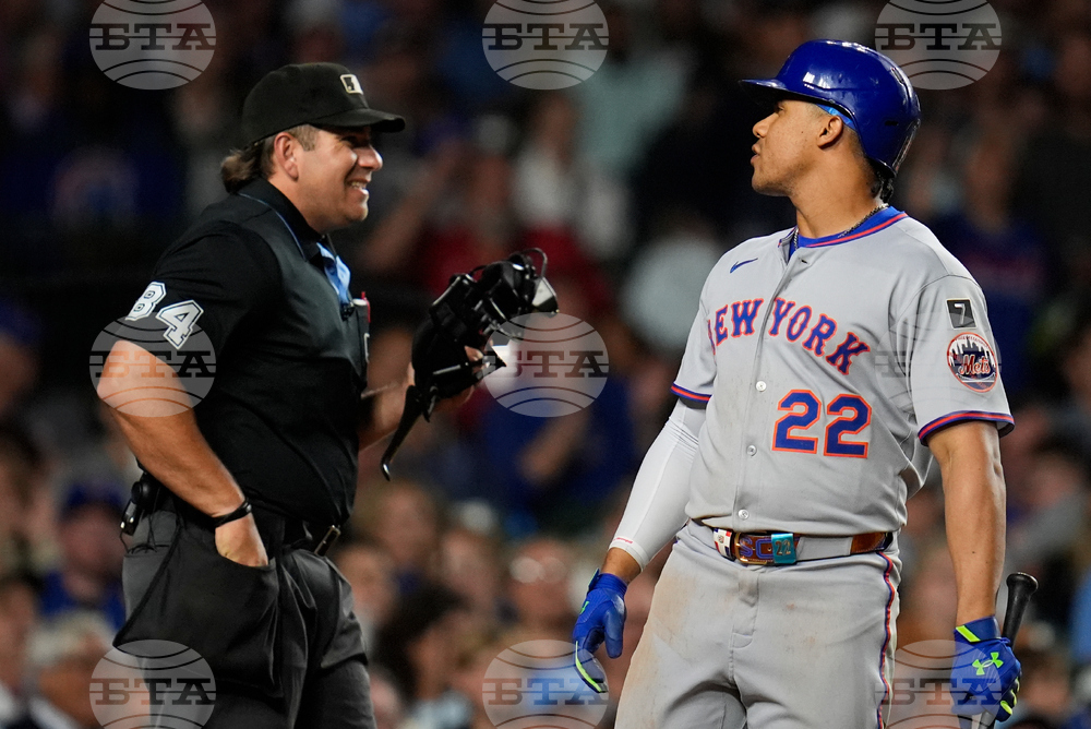 New York Mets' Juan Soto (22) has a brief chat with umpire John Libka (84) during the sixth inning of a baseball game Tuesday, Sept. 23, 2025, in Chicago. (AP Photo/Erin Hooley)