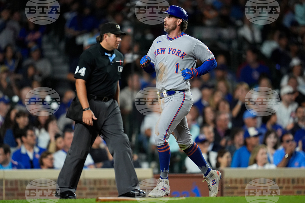 New York Mets' Jeff McNeil (1) scores on a single from Francisco Lindor (12) during the sixth inning of a baseball game against the Chicago Cubs, Tuesday, Sept. 23, 2025, in Chicago. (AP Photo/Erin Hooley)