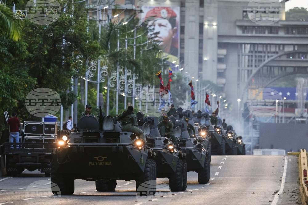 Armored vehicles drive through a street during a government-organized march in support of President Nicolas Maduro in Caracas, Venezuela, Tuesday, Sept. 23, 2025. (AP Photo/Jesus Vargas)