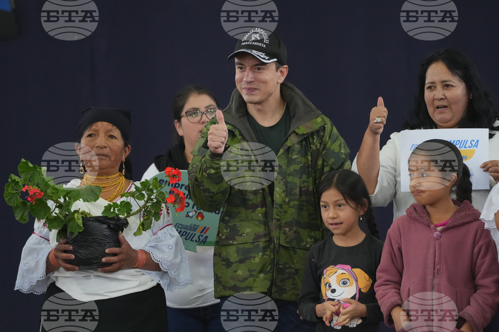 Ecuador's President Daniel Noboa flashes a thumbs to the crowd during an event to deliver benefits and to decry the protests against diesel price hikes following his fuel subsidy cuts, in Otavalo, Ecuador, Wednesday, Sept. 24, 2025. (AP Photo/Dolores Ochoa)