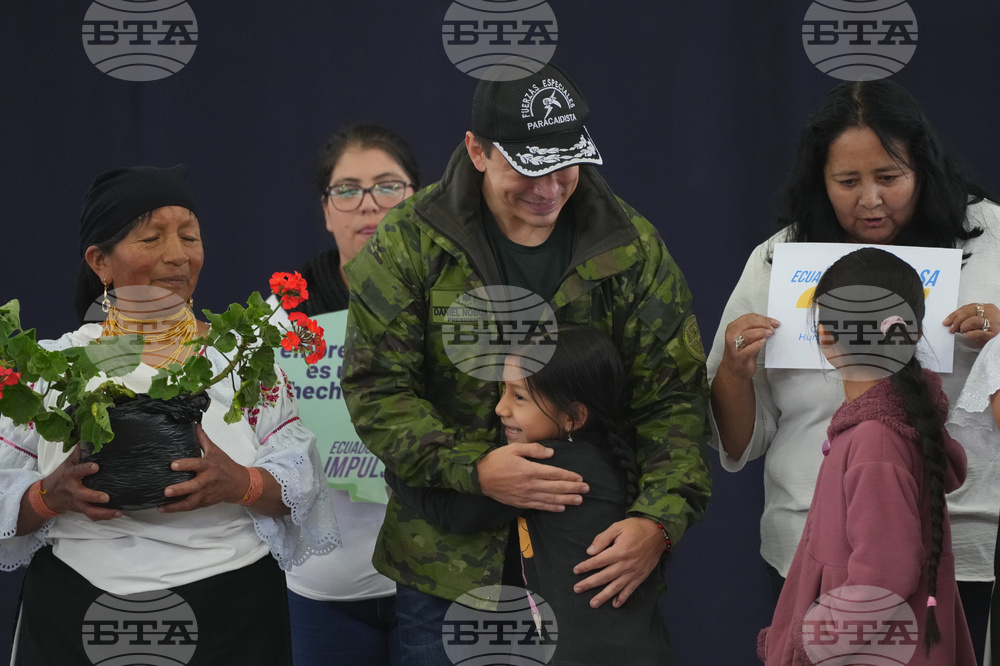 Ecuador's President Daniel Noboa is embraced by a child during an event to deliver benefits and to decry the protests against diesel price hikes following his fuel subsidy cuts, in Otavalo, Ecuador, Wednesday, Sept. 24, 2025. (AP Photo/Dolores Ochoa)