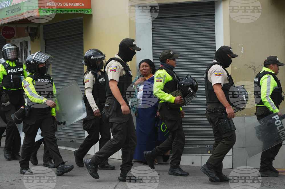 Police officers arrive to guard the Colegio Jacinto Collahuazo where President Daniel Noboa attends an event to deliver benefits and to decry the protests against diesel price hikes following his fuel subsidy cuts, in Otavalo, Ecuador, Wednesday, Sept. 24, 2025. (AP Photo/Dolores Ochoa)
