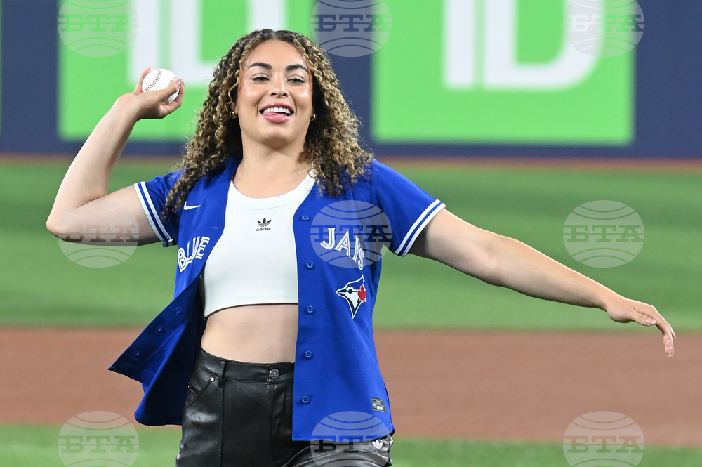 Canadian hockey player Sarah Nurse throws out the ceremonial first pitch prior to the start of an American League baseball game between the Toronto Blue Jays and the Boston Red Sox in Toronto on Tuesday, Sept. 23, 2025. (Jon Blacker/The Canadian Press via AP)