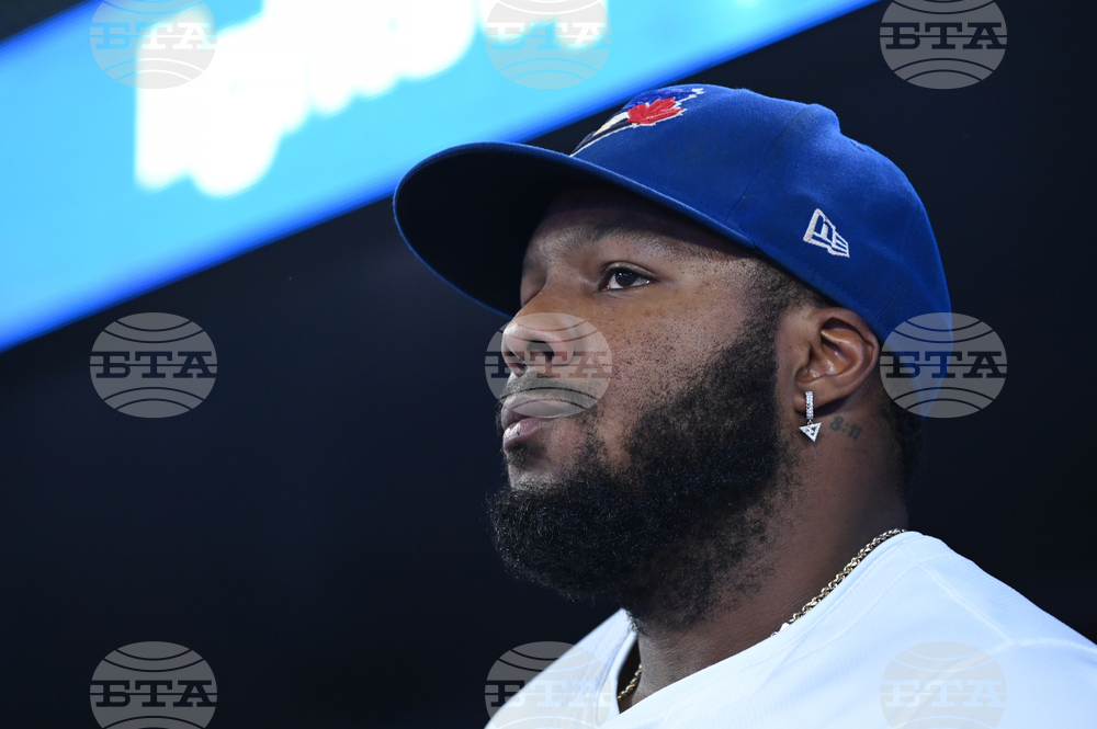 Toronto Blue Jays first baseman Vladimir Guerrero Jr. (27) looks on before taking the field against the Boston Red Sox in American League baseball action in Toronto on Tuesday, Sept. 23, 2025. (Jon Blacker/The Canadian Press via AP)