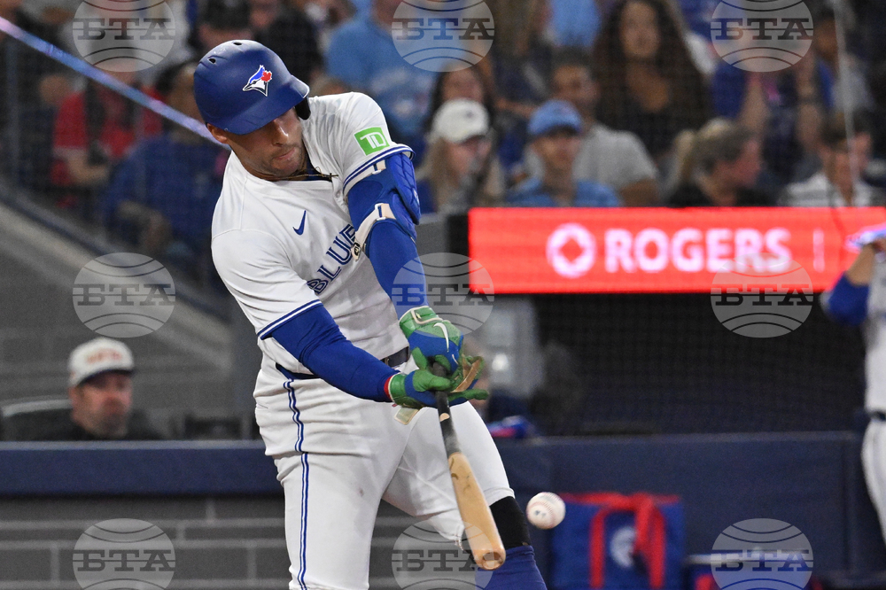 Toronto Blue Jays' George Springer (4) hits a single against the Boston Red Sox in the fourth inning of a baseball game in Toronto, Ontario, Tuesday, Sept. 23, 2025. (Jon Blacker/The Canadian Press via AP)